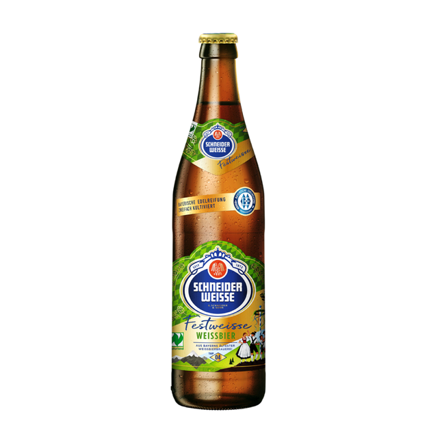 Ideal for celebrating: “Festweisse” – the bright, golden wheat beer, reissued according to the old festival beer recipe. It owes its fresh, bitter note to the valuable Cascade hops and the fruity Schneider yeast - a pleasure that couldn't be more refreshing and drinkable. Tastes great with fine greens, with light dishes, and – of course – in a festive setting.